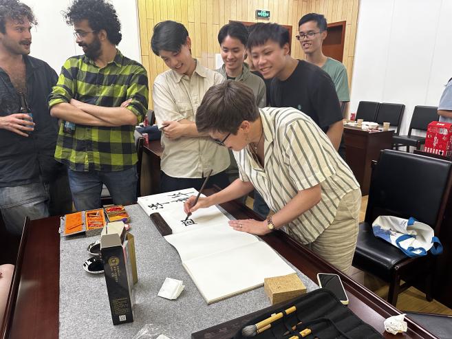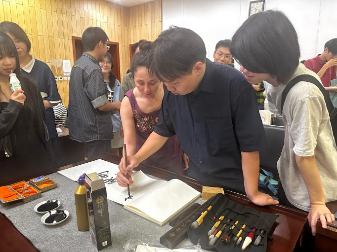 暑期学校课程结束后,逻辑学中心组织了师生联谊活动。活动现场气氛热烈,暑校学生纷纷献上精彩才艺,展现多元文化背景下的交流。清华大学本科生许万赫同学现场展示了中国书法艺术,并邀请在场外国学者和同学共同挥毫创作,体验汉字之美。
